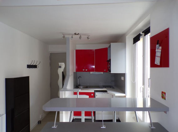Studio (équipé) en duplex, comprenant une pièce principale (avec clic clac) avec cuisine équipée à l'étage coin nuit (le couchage reste) et salle d'eau (à revoir) et wc.